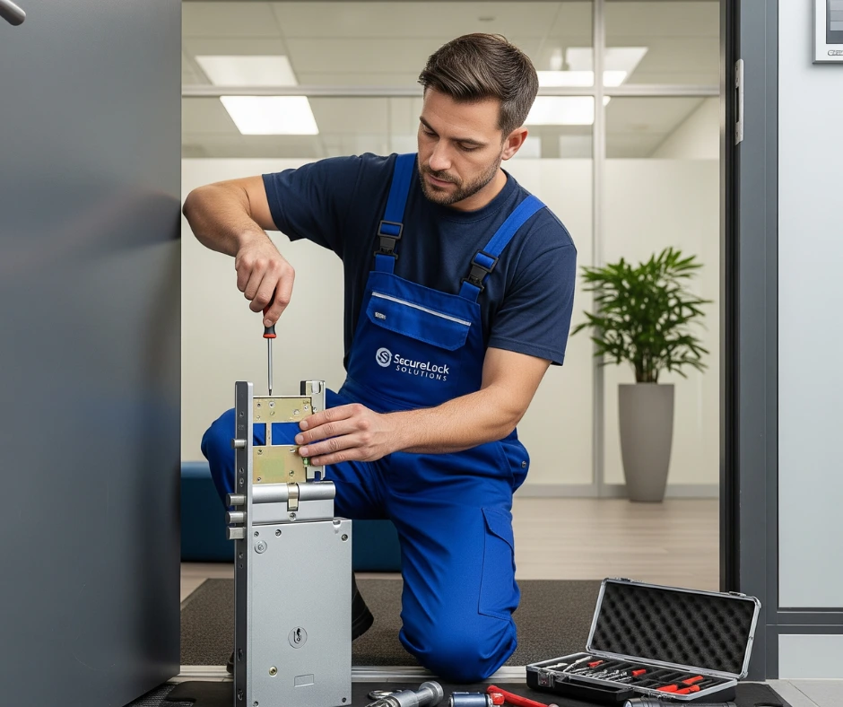 Young technician performing Sliding door lock repair in a modern, uniquely designed office environment