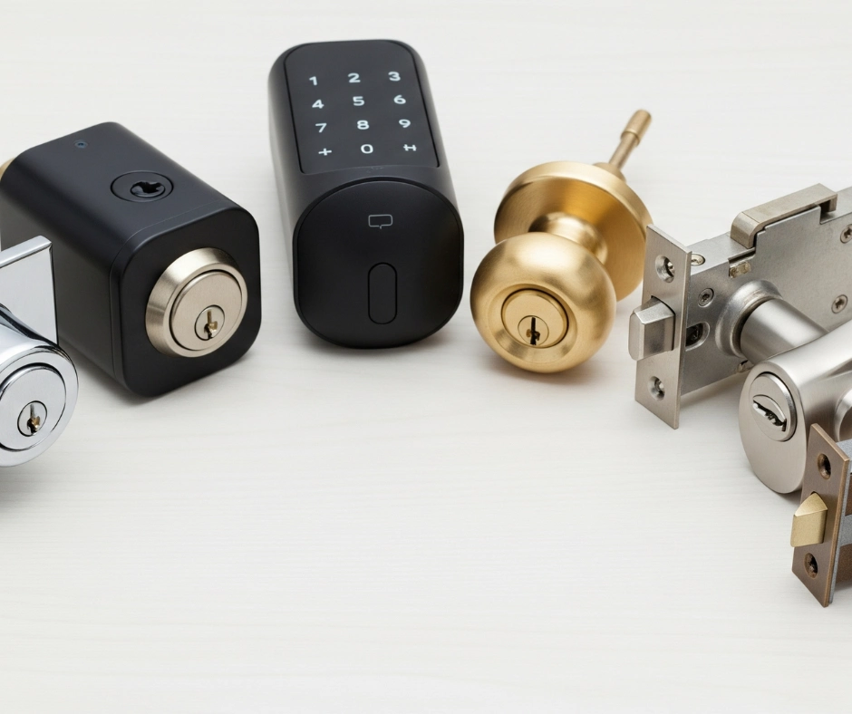 Different types of locks we install including deadbolts, padlocks, smart locks, and knob locks, showcasing a variety of security options.